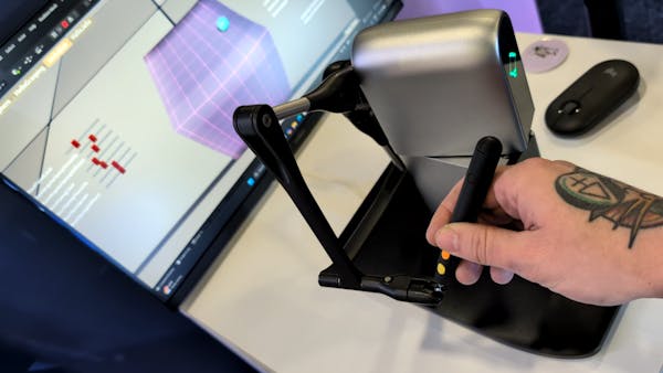 The secret sauce in the MinVerse, as well as its Inverse3 and Inverse3 X big brothers, is haptic force feedback. The stylus rides on arm linkages with motors on the other ends. Those motors can create resistance to movement in any axis, so users can feel virtual bodies.