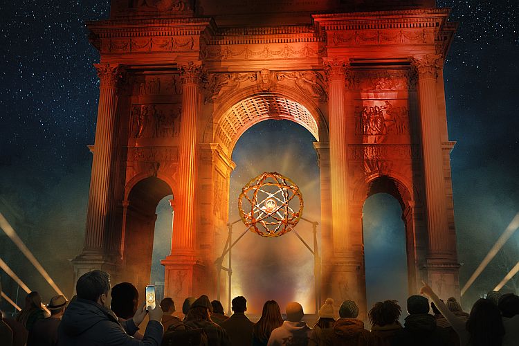 “The structure features variable geometry, with a diameter that expands from 3.1 meters when closed to 4.5 meters when open [10.2 to 14.8 feet]. The complex mechanical system integrates 244 pivot points and 1,440 components, mounted on pins and bearings. At its core, the Flame is enclosed in a glass-and-metal container and makes use of sustainable scenic effects: no material fallout, low acoustic impact, minimal smoke emissions and complete safety for environments in contact with the public.”