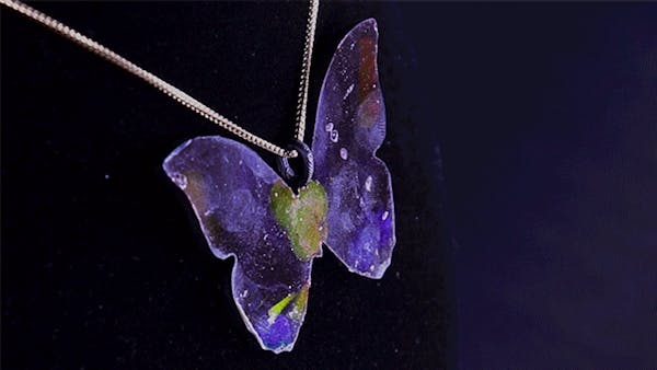 To prove the concept, the team has used MorphoChrome to create objects ranging from artistic to practical: a butterfly necklace shifts its colors depending on the angle from which it's viewed, while a pair of golfing gloves shine green when their user is gripping the club correctly.