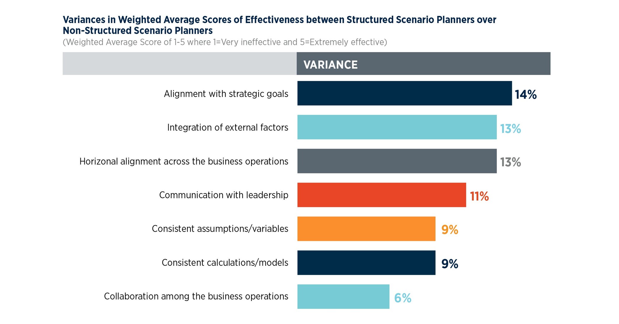 Top performers: Finance teams that use structured scenario planning report 14% higher strategic alignment, 13% higher external factor integration and 13% higher horizontal business alignment than peers who do not.